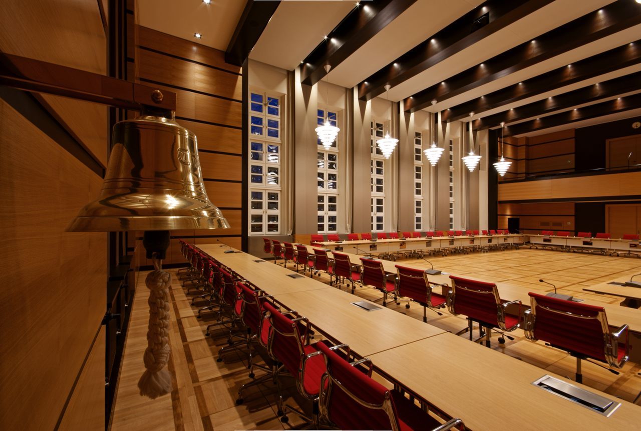 Beleuchtung, Materialien, Möblierung und eine zeitgemäße technische Ausstattung unterstreichen die moderne Haltung, die den Ratssaal auch ursprünglich auszeichneten.