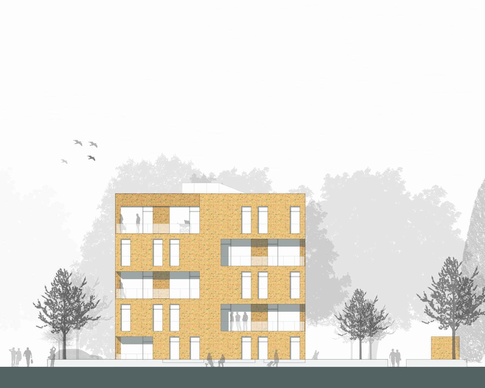ergänzt hier als Solitär mit seiner Kubatur und Höhe die städtebaulich markante Ecke an der Kreuzung. Das Gebäude setzt sich selbstbewußt von der heterogenen Nachbarbebauung ab ohne als Fremdkörper zu wirken. Insgesamt soll das neue Wohngebäude erheblich zur ursprünglichen Attraktivität dieses Bereiches von Heppens beitragen und die vorhandenen städtebaulichen Qualitäten wieder ordnen.